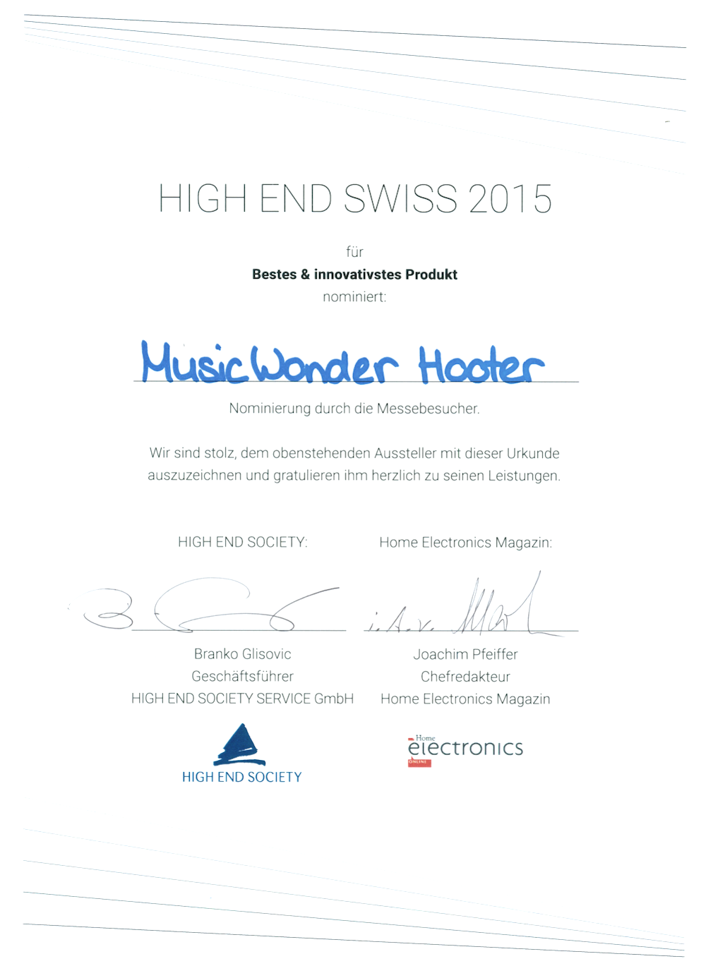 Wir haben unsere Lautsprecher und Elektronik bereits mehrere Male an der High End Swiss in Regensdorf präsentiert. 2015 wurden unsere «Hooter» zum besten und innovativsten Produkt der Messe nominiert.